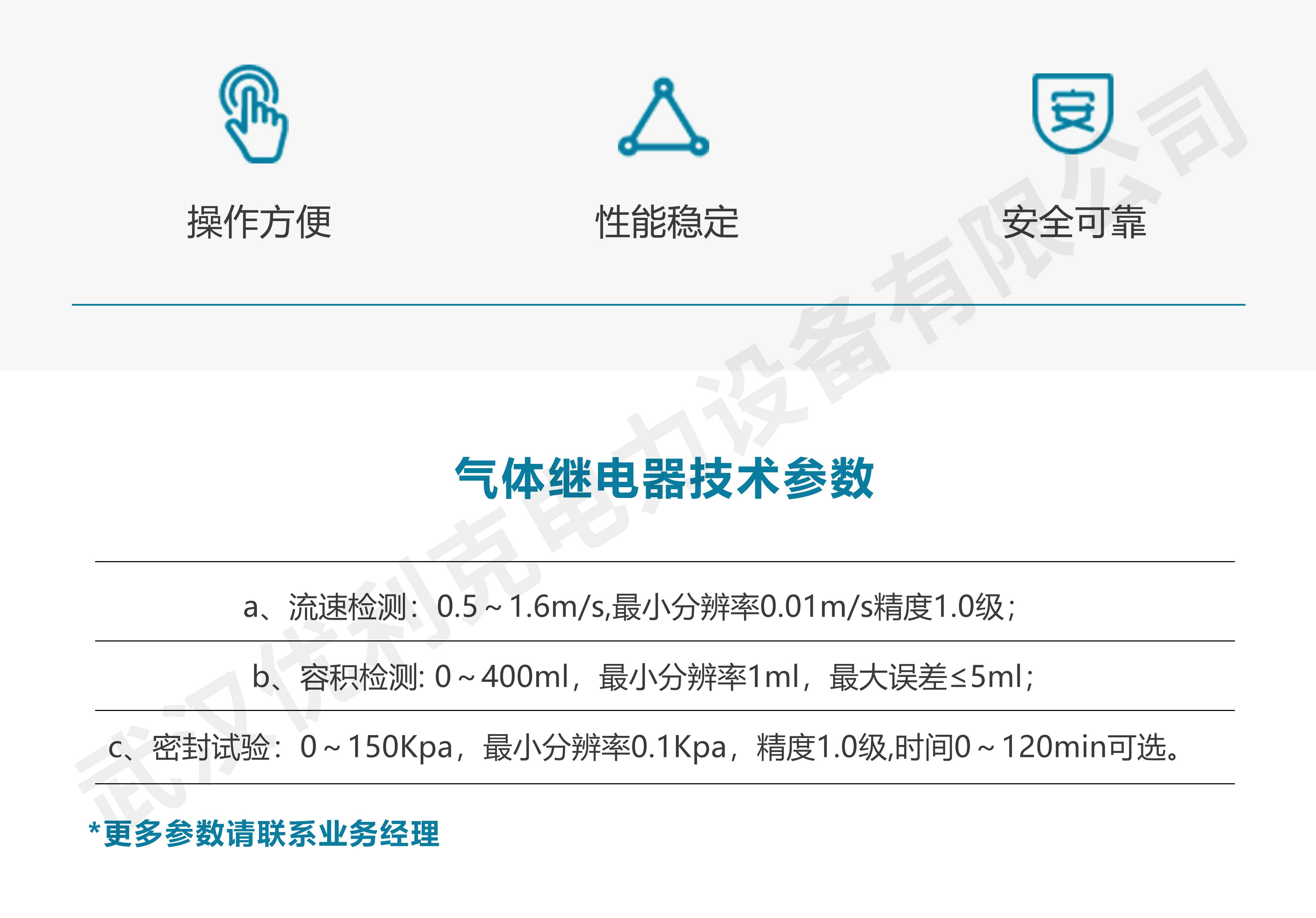 a、開啟壓力檢測:0~150Kpa,最小分辨率0.1Kpa,精度1.0級; b、關閉壓力檢測:0~150Kpa,最小分辨率0.1Kpa,精度1.0級。