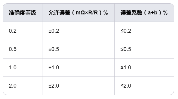 根據(jù)標(biāo)準(zhǔn),回路電阻測(cè)試儀的準(zhǔn)確度等級(jí)和允許誤差如下表所示:
