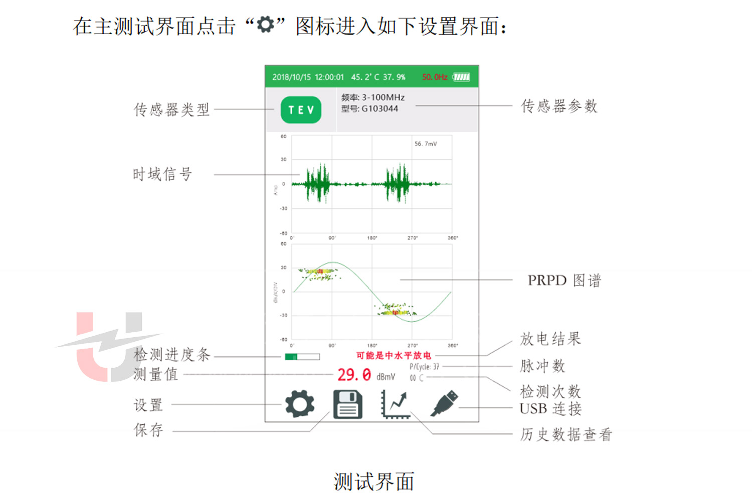 辨圖譜(PRPD)、相位分辨脈沖序列圖(PRPS)等,方便操作人員進(jìn)行數(shù)據(jù)分析和判斷。操作按鍵則用于用戶與儀器進(jìn)行交互,實